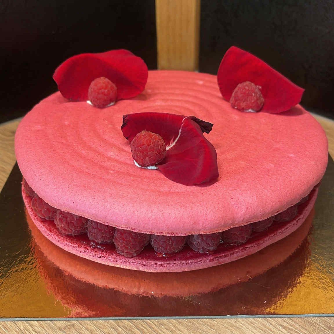 Coque de Macaron, mousse vanillée, framboises fraiches