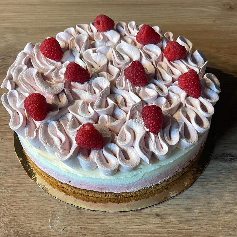 Biscuit Dacquoise noisette, mousse framboise, mousse chocolat blanc et Chantilly framboises