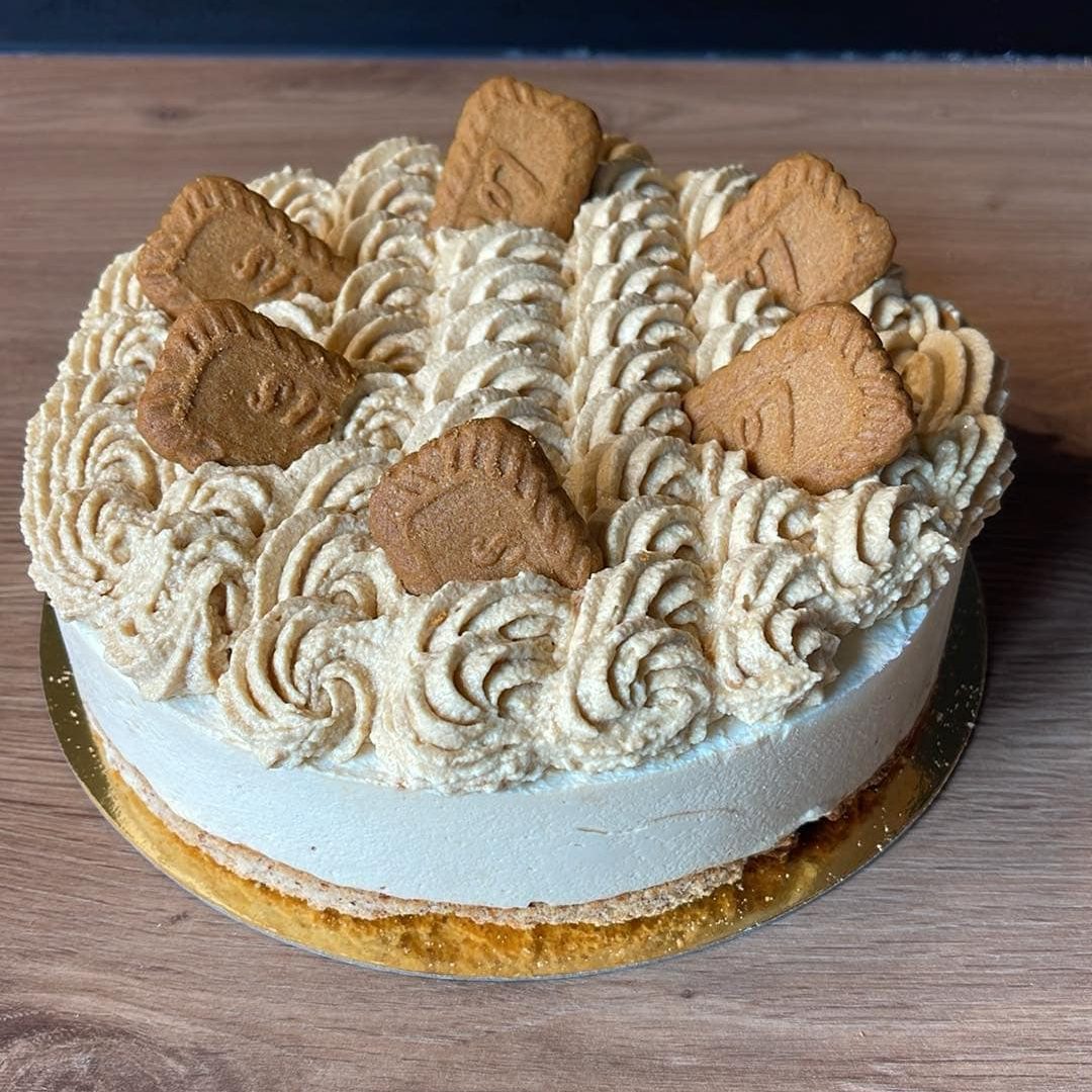 Biscuit Dacquoise noisette, mousse spéculos, biscuit spéculos, mousse chocolat blanc et chantilly spéculos