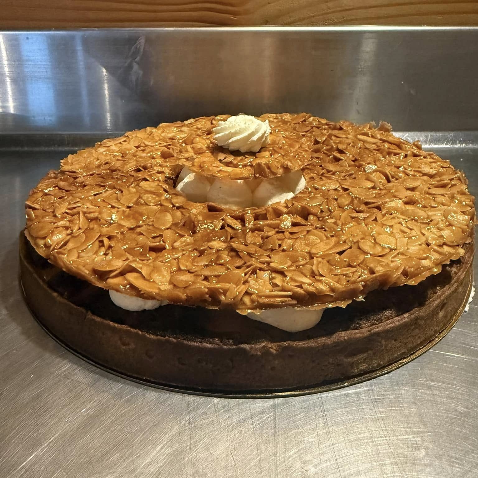 Pâte sablé amande, praliné coulant, ganache chocolat au lait et Ganache monter chocolat lait